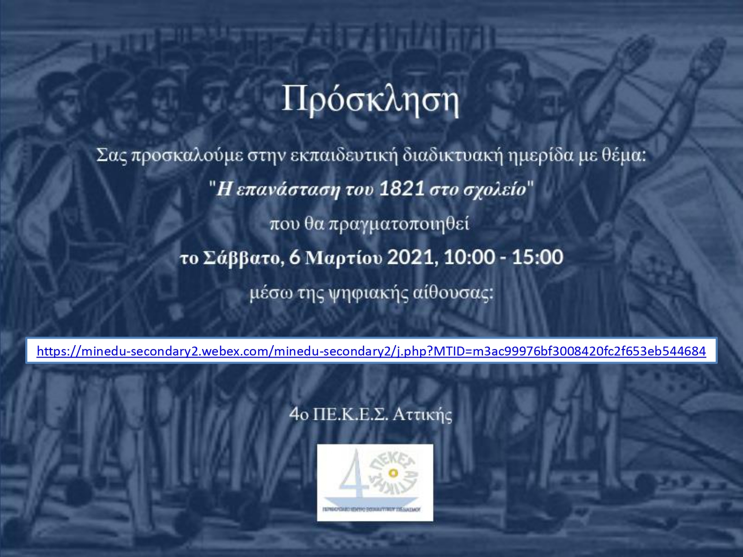 Καλούνται οι μαθητές και οι μαθήτριες του σχολείου μας να παρακολουθήσουν το Σάββατο διαδικτυακή ημερίδα σχετικά με την επέτειο των 200 χρόνων από την Επανάσταση του 1821. Στα συνημμένα το πρόγραμμα. Η παρακολούθηση είναι προαιρετική.