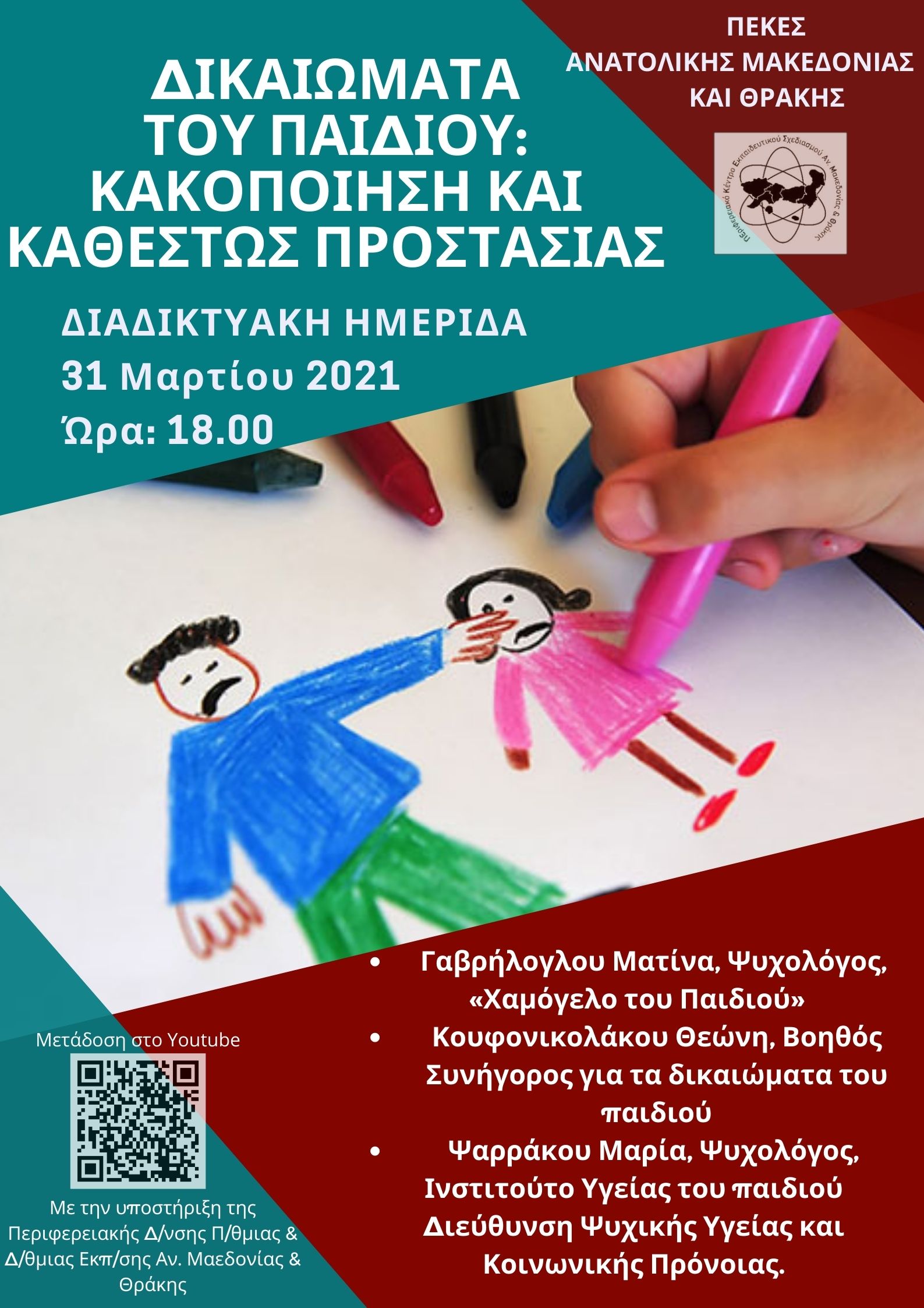 Το ΠΕ.Κ.Ε.Σ. (Περιφερειακό Κέντρο Εκπαιδευτικού Σχεδιασμού) Ανατολικής Μακεδονίας & Θράκης οργανώνει σήμερα Τετάρτη 31/03 διαδικτυακή ημερίδα. Το θέμα, το πρόγραμμα και ο σύνδεσμος εισόδου στα συνημμένα έγγραφα.